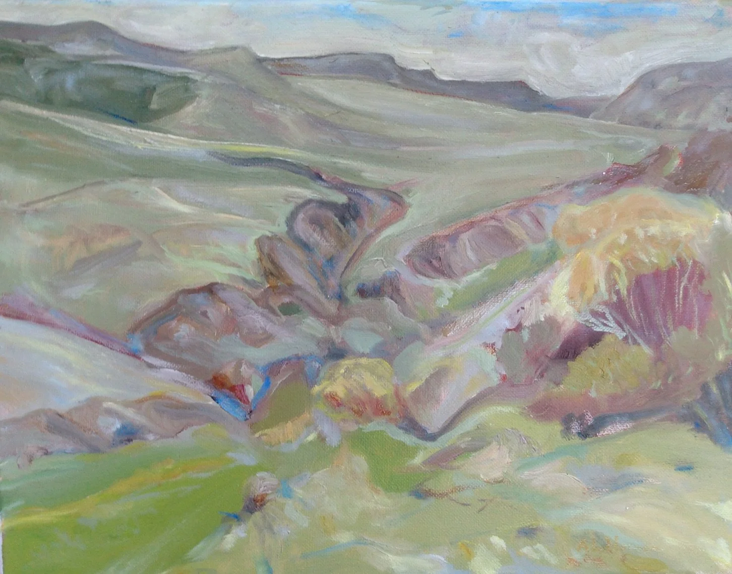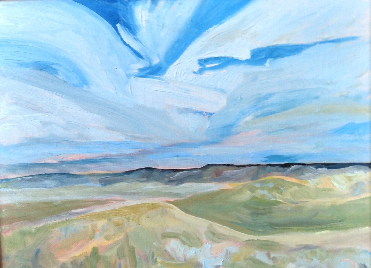 The motion apparent where the land and sky meet, or creeks and rivers reveal their hidden spaces, are depicted in oils or acrylic from painting outside in southern Alberta and Saskatchewan with the intent to capture the "voice" revealed by the land. The joy in painting and drawing is also explored by hosting a group of like-minded artists in the Southwest Saskatchewan Drawing Group that meets monthly in Shaunavon or Eastend to practice life drawing.